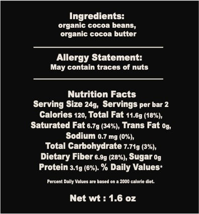 Ingredients(all organic, always): cacao beans, cocoa butter.