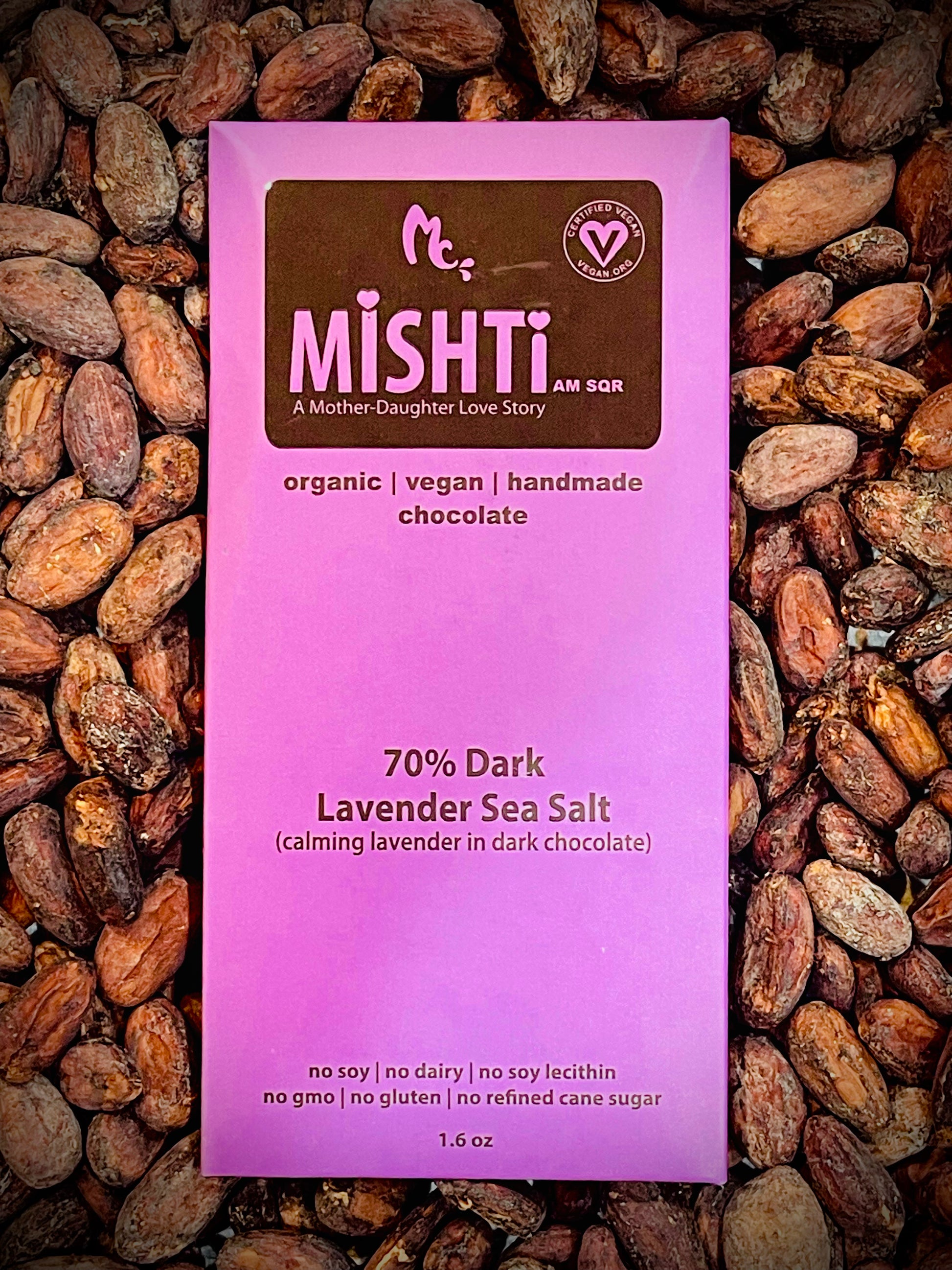 Ingredients (all organic, always): cacao beans, unrefined coconut sugar, organic cocoa butter, lavender, sea salt.