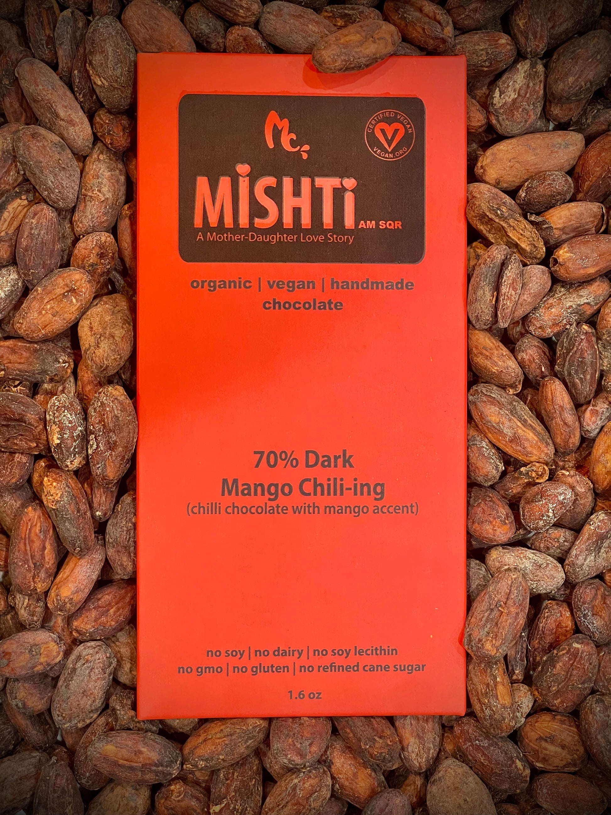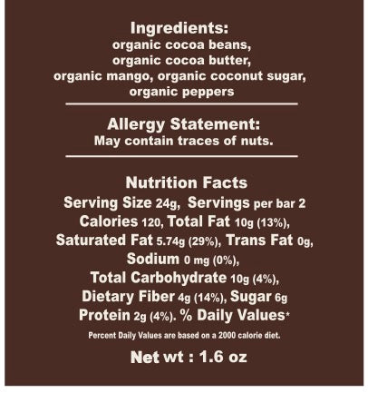 Ingredients (all organic, always): cacao beans, unrefined coconut sugar, dried mango, chili peppers.