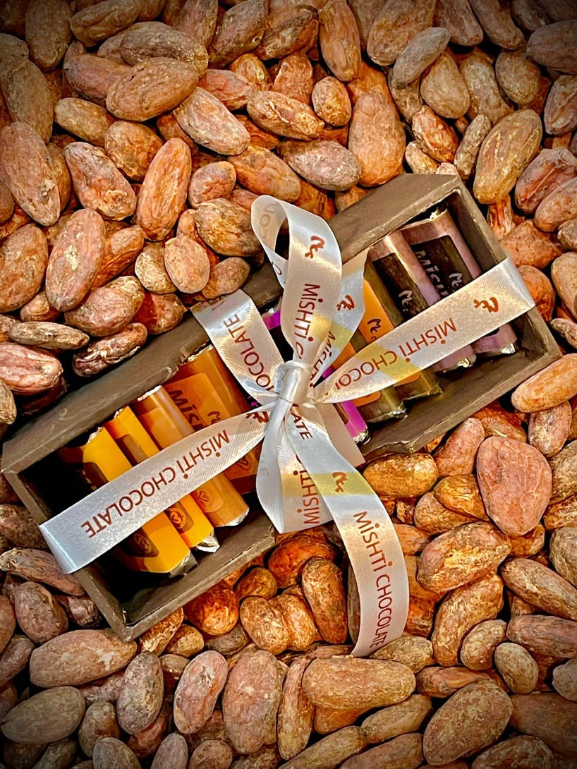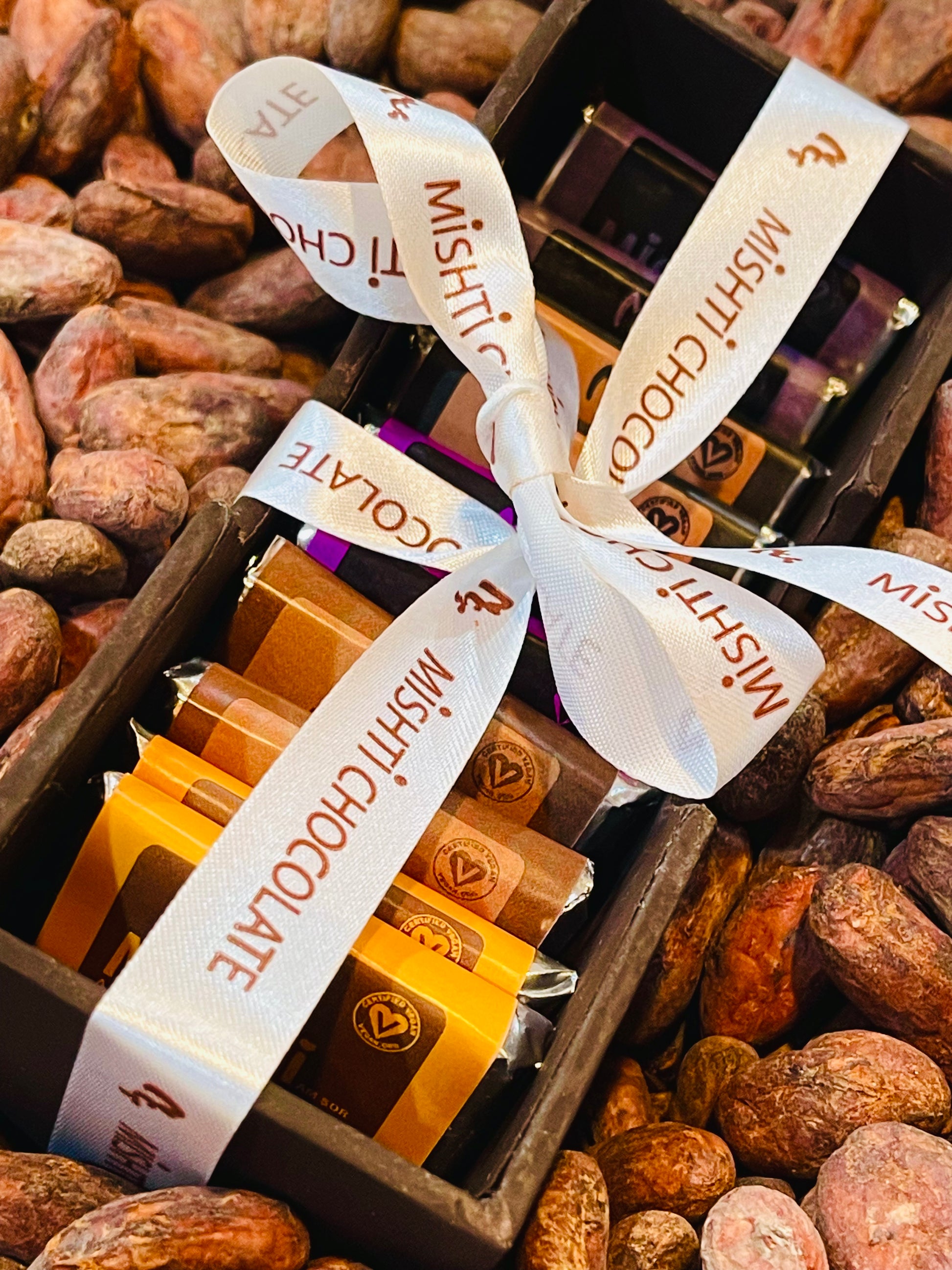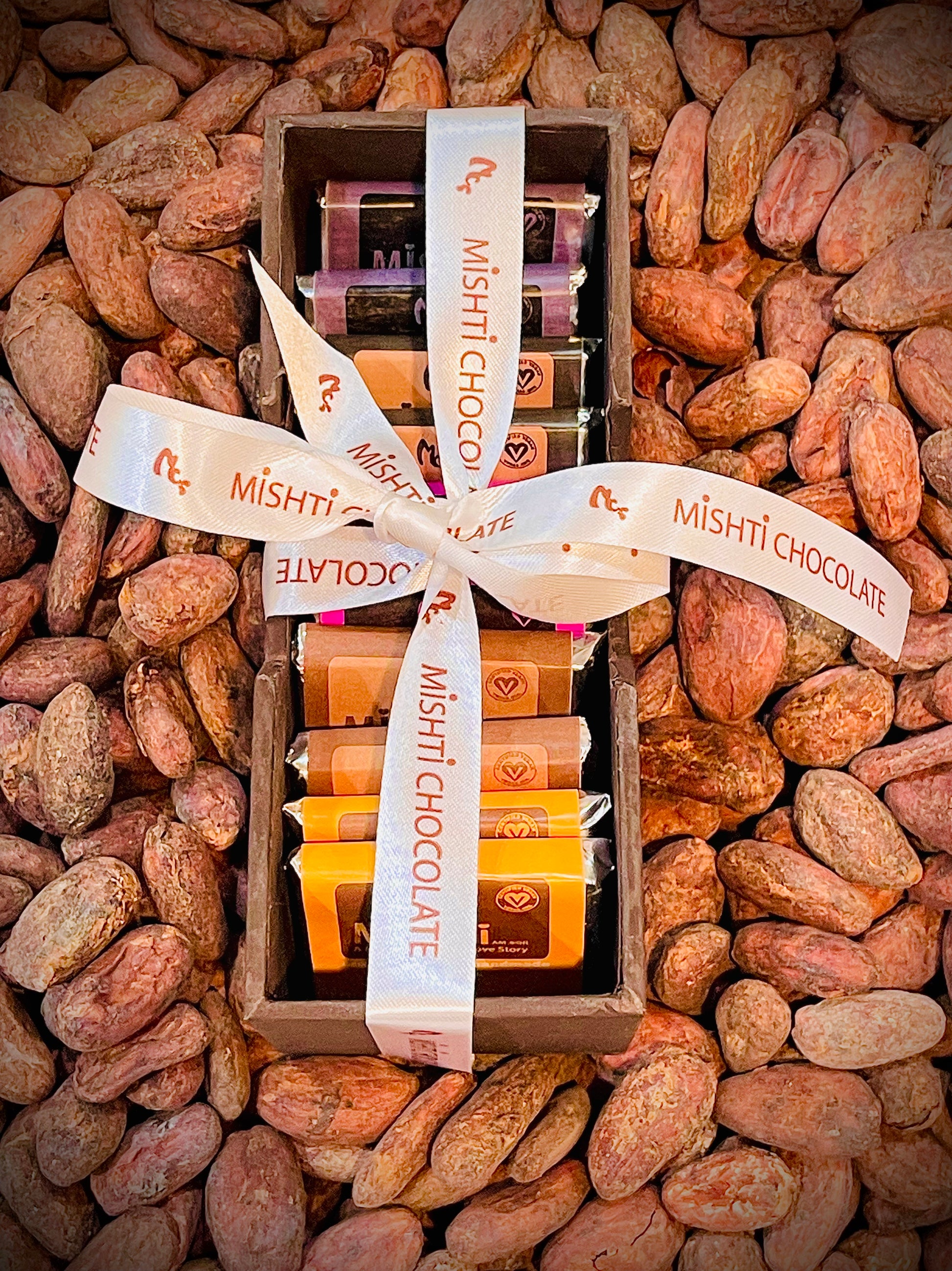 Unique handcrafted mini chocolate collection with 10 mini bars, featuring 5 different flavors, packaged in a special gift box. Each mini bar is around 0.5oz.
